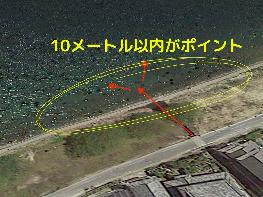 まずは川の流れ込みを探しましょう。流れ込みから10メートル以内が釣れるポイント。