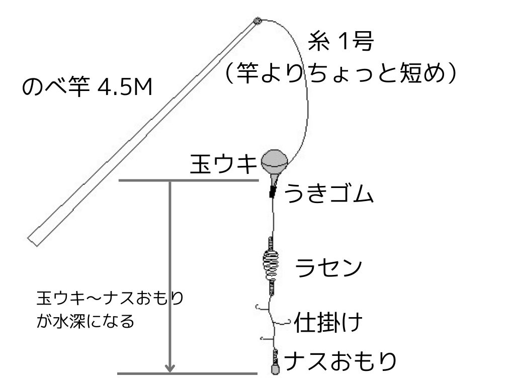 水深が浅いところは、底に引っかかってしまうので、ウキとオモリの間を短くします。
