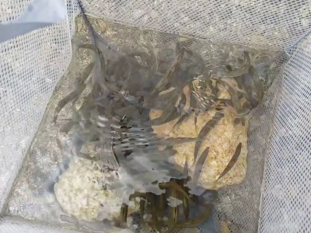 覗いてみると、魚籠(びく)の中は小鮎でいっぱい。