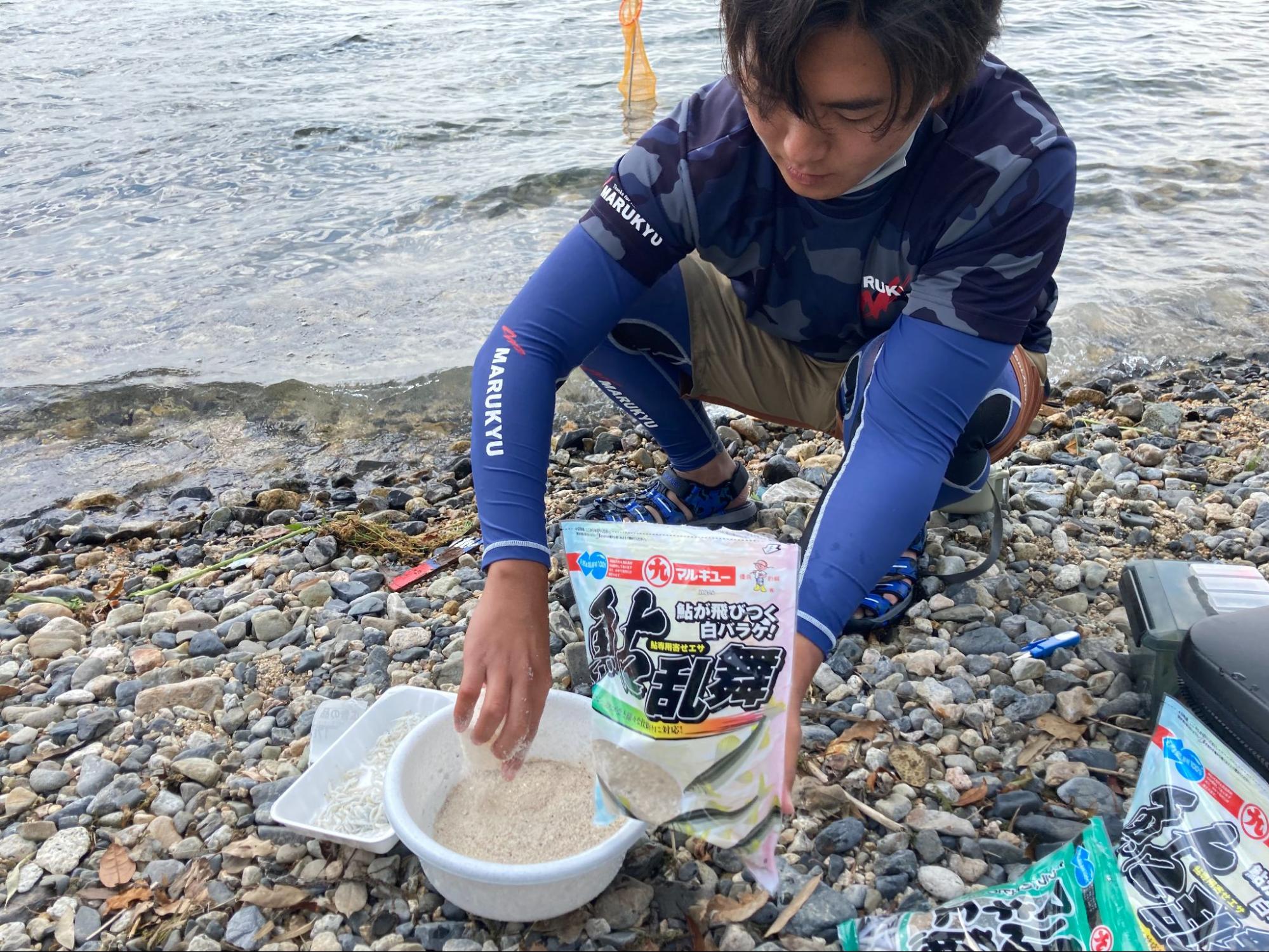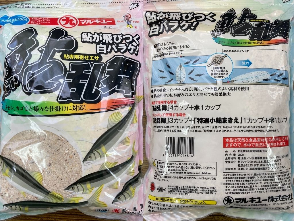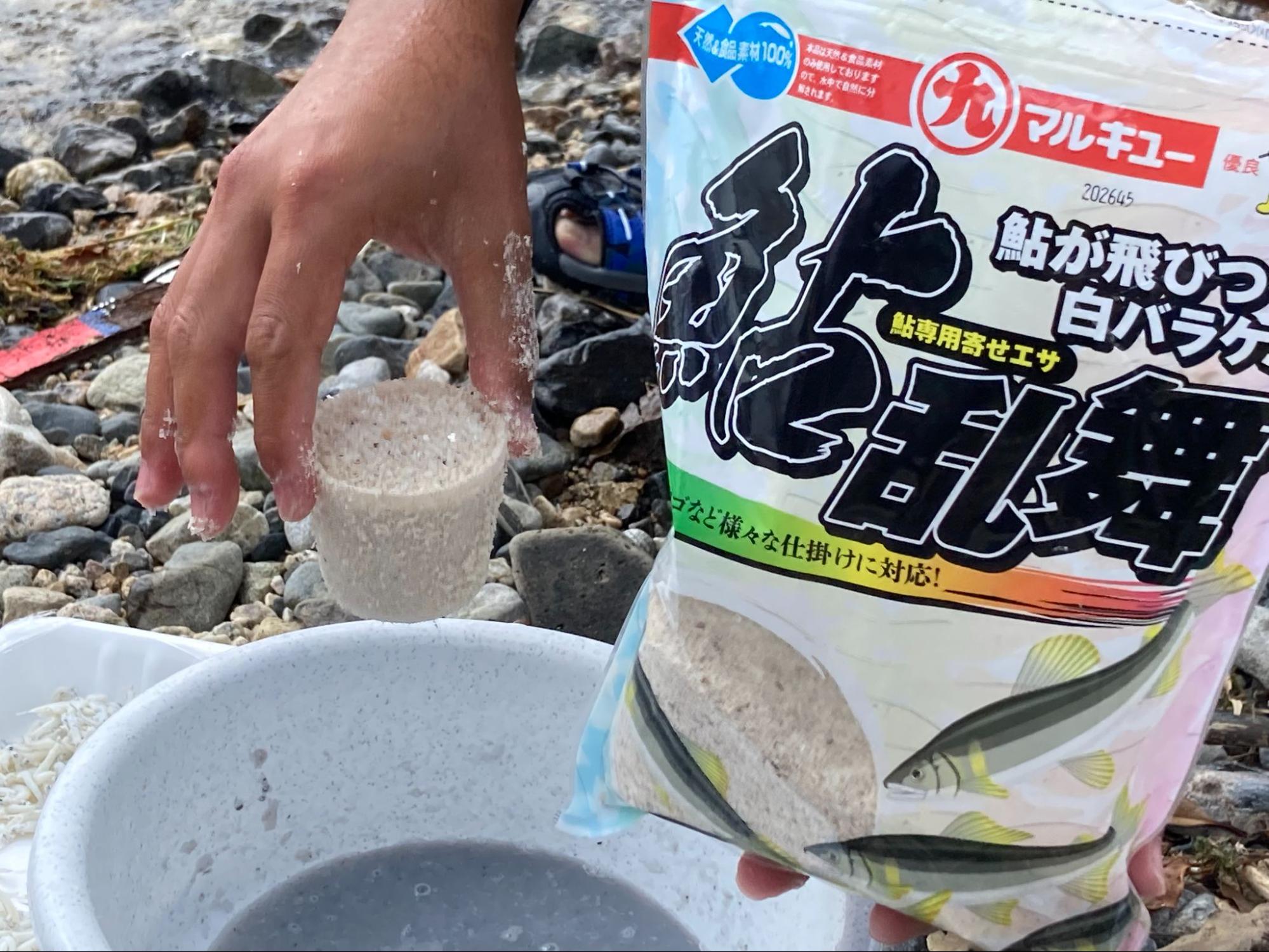小鮎釣りに欠かせないマキエは、ドライタイプのマルキユー「鮎乱舞」と、「釜あげしらす」をブレンド。現地に合わせたマキエを作ることにしました。