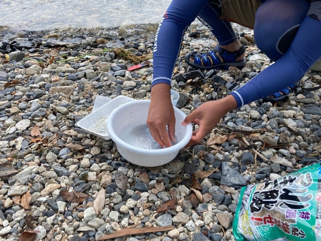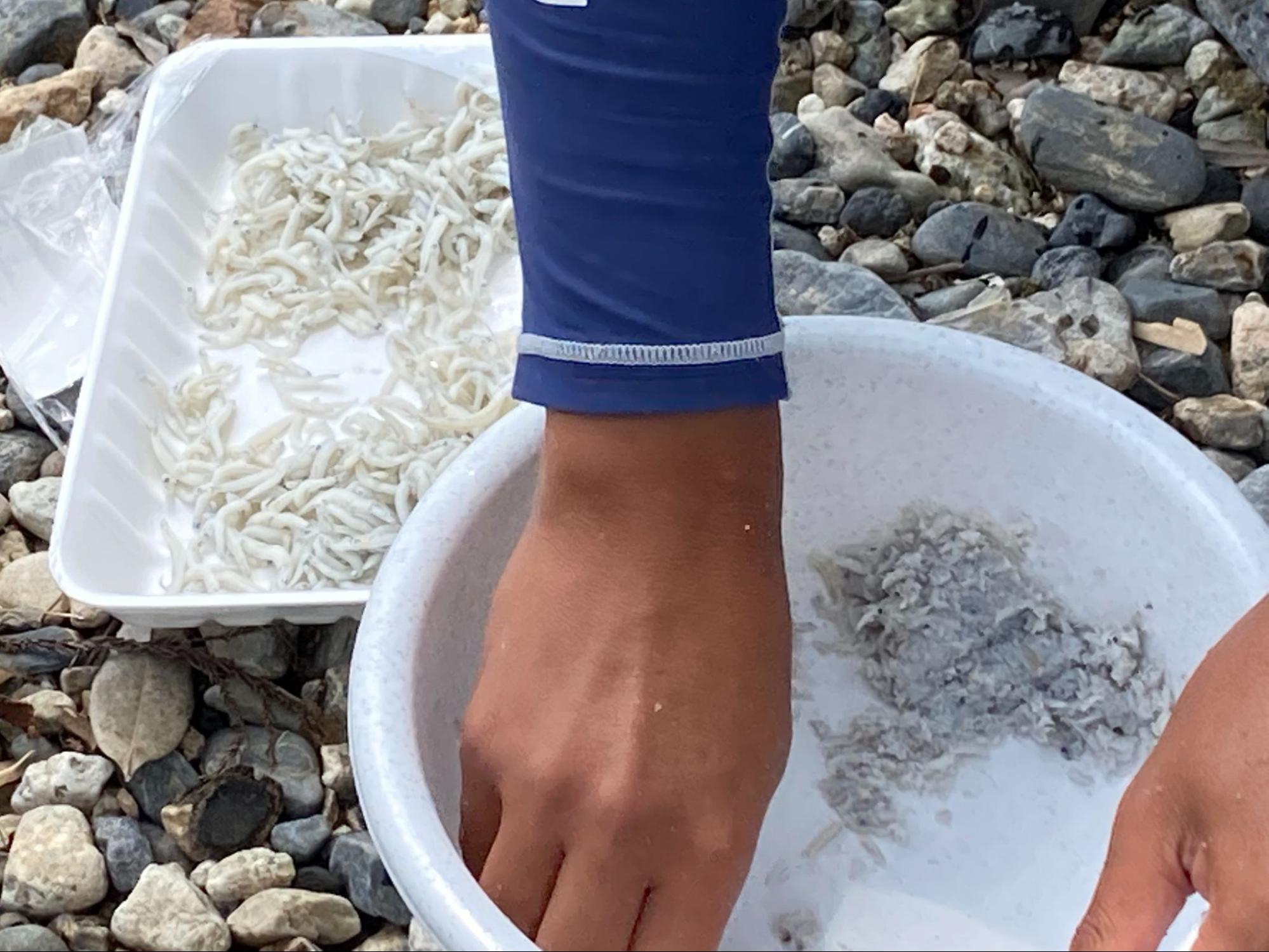 次は、地元の釣り人たちをヒントに、餌の準備をします。