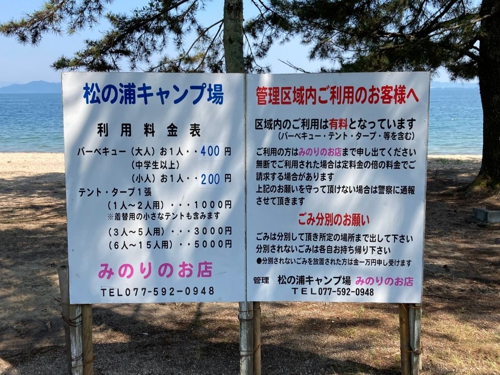 木戸湖岸緑地は火を使えませんが、隣接する松の浦水泳場にはキャンプ施設があります。